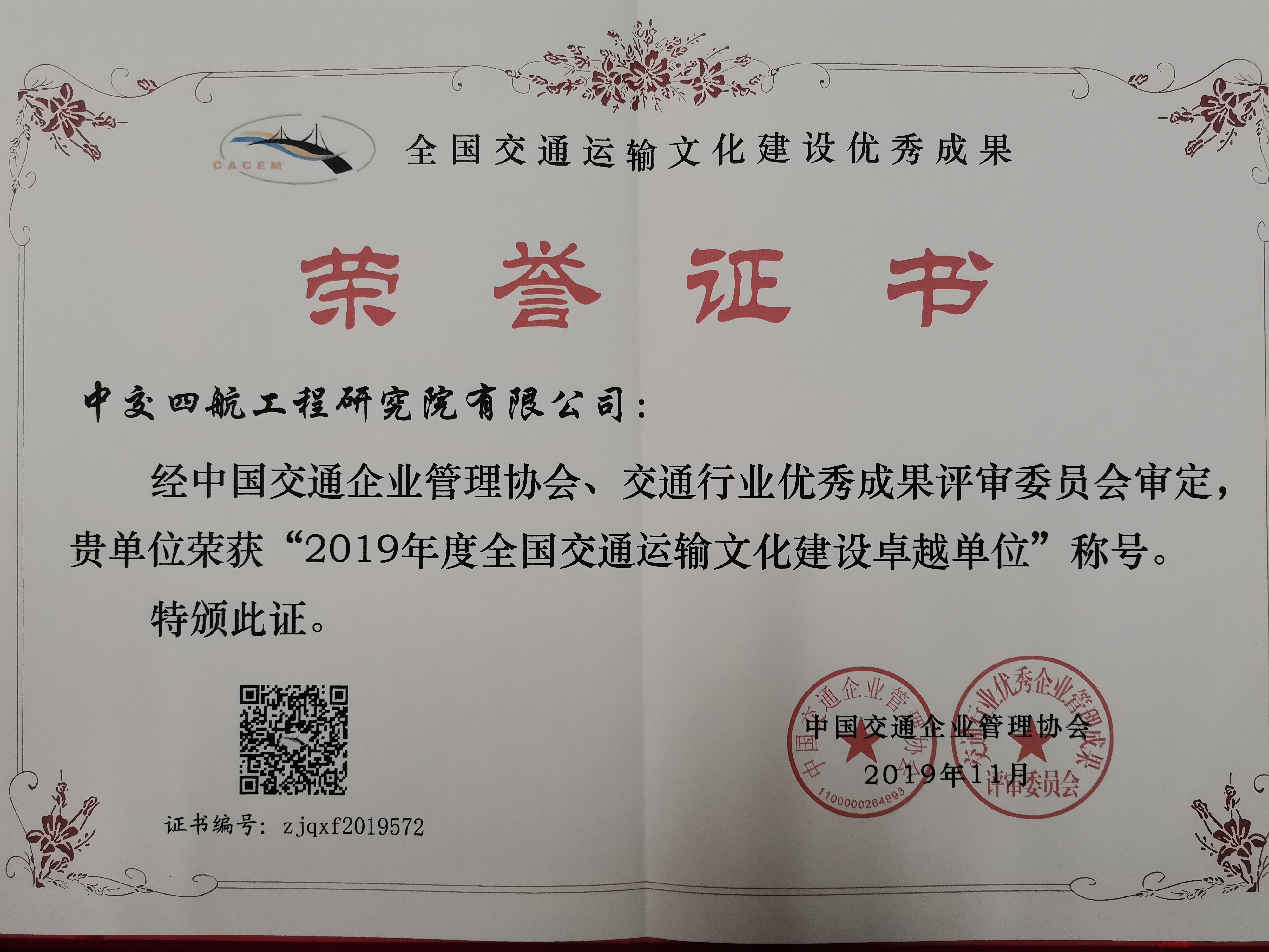 研究院再次荣获“2019年度全国交通运输文化建设卓越单位”称号,体现了研究院持续推进企业文化建设的良好成果,进一步提升了研究院作为科技型企业的品牌形象。