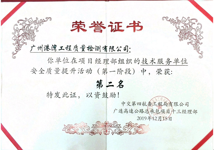 12月15日,检测公司广连高速公路十三经理部工地试验室在项目经理部组织的技术服务单位安全质量提升活动第一阶段中获得第二名的佳绩。