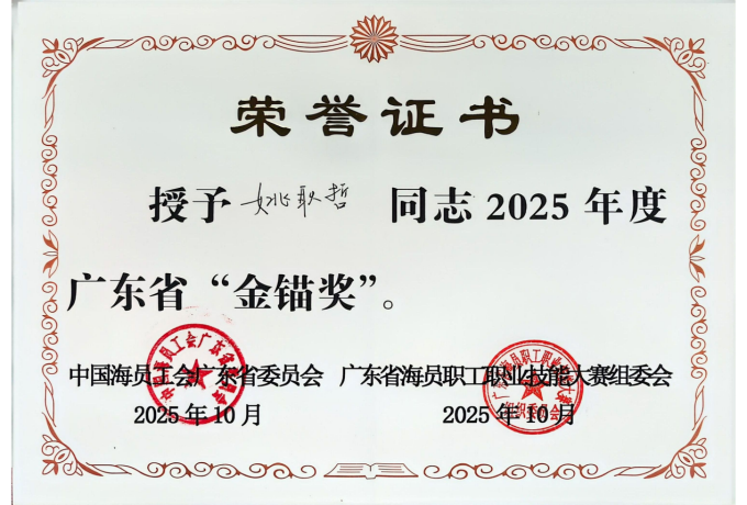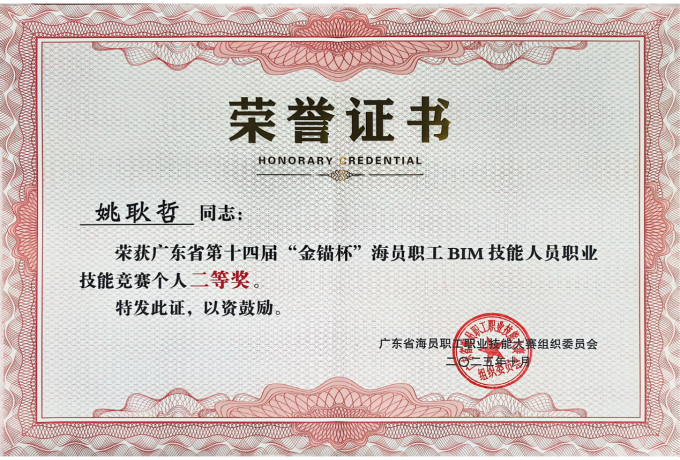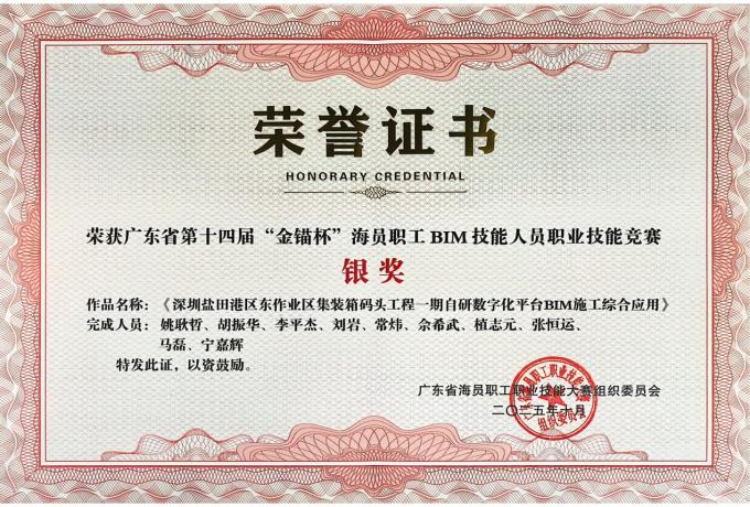 近日,由广东省总工会、广东省人力资源和社会保障厅等单位联合主办,广东省海员工会承办、中交四航院实施的广东省第十四届“金锚杯”海员职工BIM技能人员职业技能竞赛在广州圆满落幕。研究院申报的“深圳盐田港区东作业区集装箱码头工程一期自研数字化平台BIM施工综合应用”项目获“银奖”,研究院获“优秀组织奖”,项目负责人姚耿哲获“金锚奖”和“个人二等奖”。