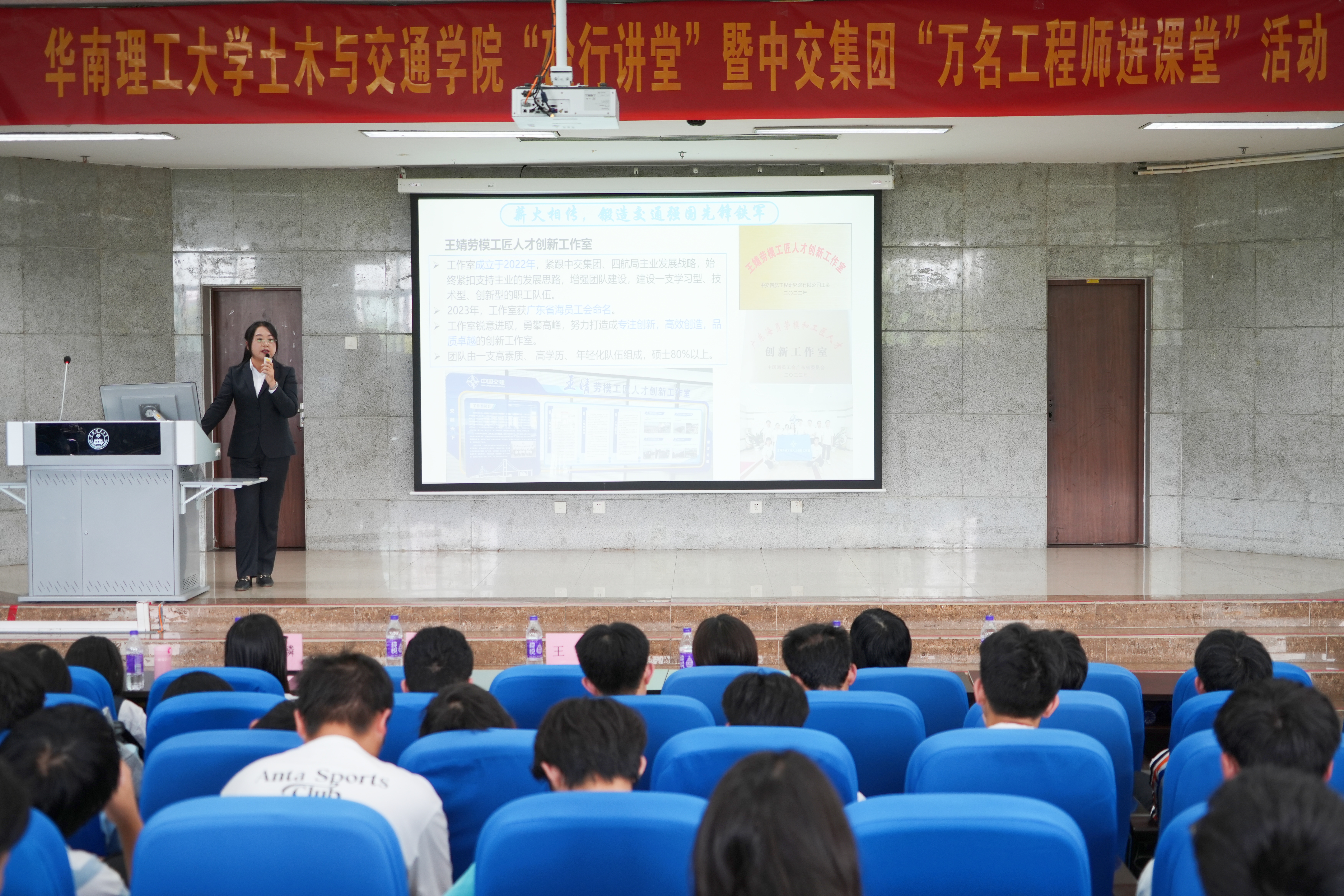 近日,全国劳动模范、研究院生态环保研究所所长王婧受邀走进华南理工大学,开展华南理工大学土木与交通学院“砼行讲堂”暨中交集团“万名工程师进课堂”活动。四航局人力资源部副总经理林斐、华南理工大学土木与交通学院党委副书记王磊出席,200余名师生共同参与。