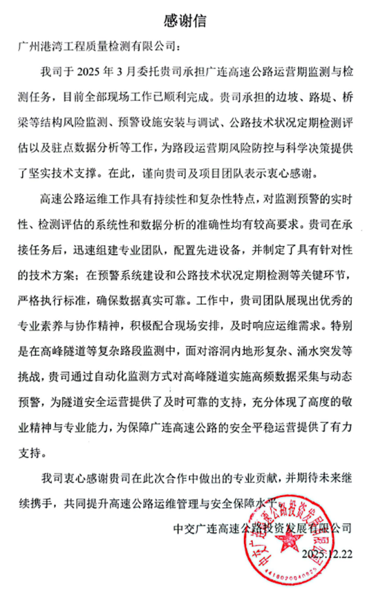 近日,广州港湾工程质量检测有限公司(以下简称“检测公司”)收到中交广连高速公路投资发展有限公司发来的感谢信,信中对检测公司圆满完成广连高速公路运营期监测与检测任务给予高度评价并表达诚挚感谢。