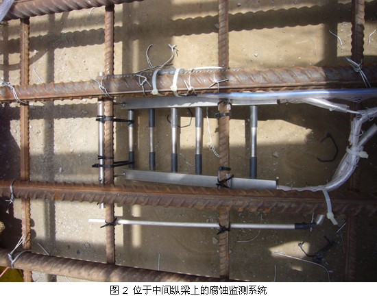 本项目的设计获得咨工与业主的认可,将要在码头上安装48套腐蚀监测系统。目前,建材所技术人员已经进场进行安装工作。由于码头不同位置的环境不同,受力情况不同,腐蚀情况也大不相同,因此,48套腐蚀监测系统将分布在码头三个断面的T桩、中间方桩、横梁、纵梁、轨道梁、预制面板以及码头面层等容易发生腐蚀的部位上,以预计和观测码头在运行过程中的钢筋腐蚀情况。作业现场干燥、风沙大、日照猛烈,建材所技术人员克服了安装过程施工难度大的困难,紧跟项目总体施工进度,已在其中一个码头断面的桩、梁、预制板上完成15套装置的安装,且运行良好。