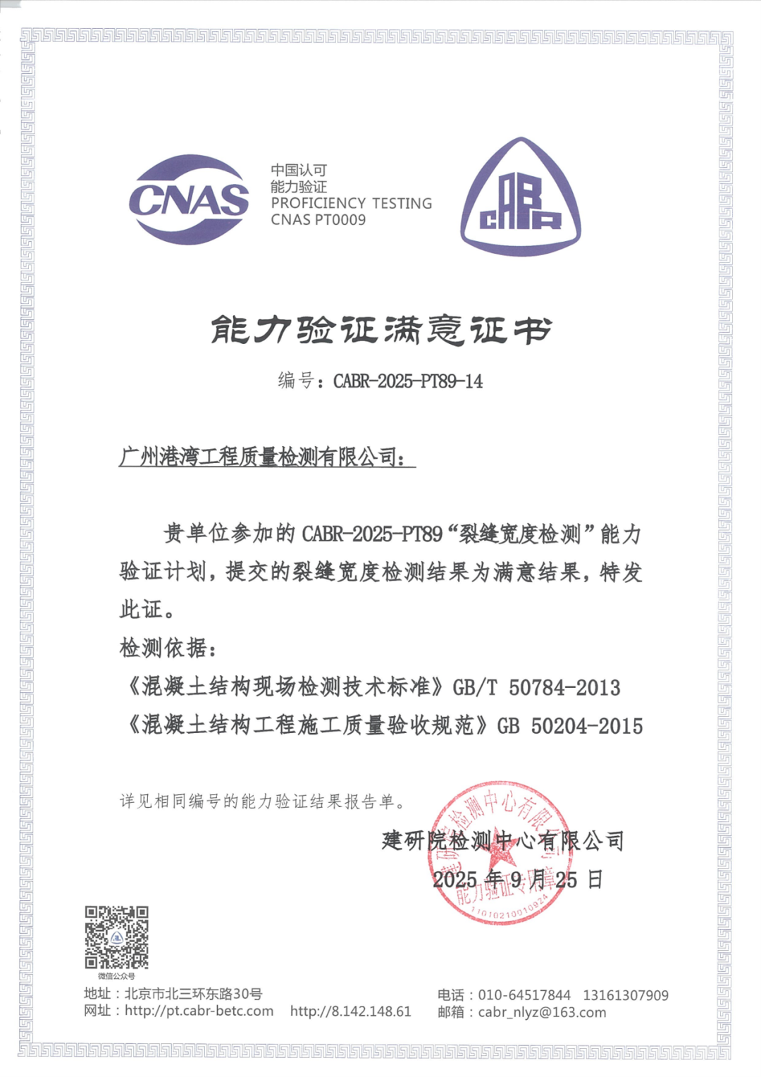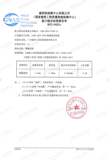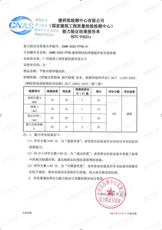近日,检测公司收到建研院检测中心有限公司发布的“建筑钢结构焊缝超声波无损检测”和“裂缝宽度检测”能力验证证书。经组织方评审组的考核,检测公司提交的两项检测结果均获得“满意”的判定结果。