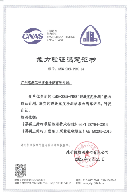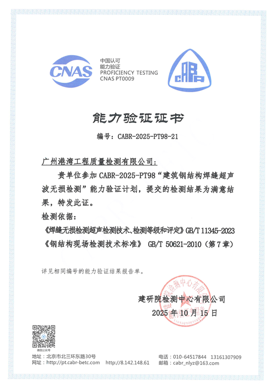 检测公司获得专项能力验证结果“满意”证书,充分展示了本单位在广东省建设工程钢结构和混凝土结构检测方面的专业技术实力,对于进一步拓展广东省建设工程检测市场,深化企业高质量发展具有积极意义。